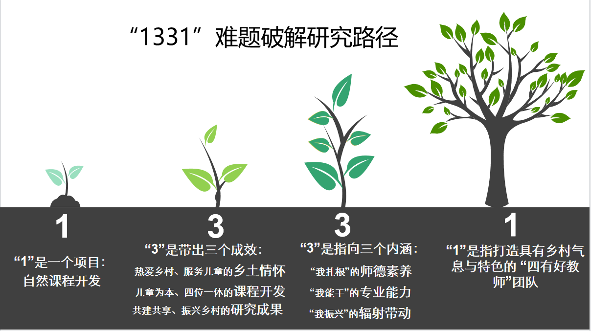 为了有效解决以上难题,尝试从1331研究路径来破解:“1”是一个项目,自然课程开发,这是培育“四有”好教师团队的土壤,“3”是依托自然课程开发带出三个成效,具有热爱乡村、服务儿童的乡土情怀,实施以儿童为本、四位一体的课程开发,实现共建共享、振兴乡村的研究成果。另一个“3”是三个成效指向三个内涵,“我扎根”的师德素养,“我能干”的专业能力,“我振兴”的辐射带动,最后一个“1”就是打造具有乡村气息与特色的“四有”好教师团队。